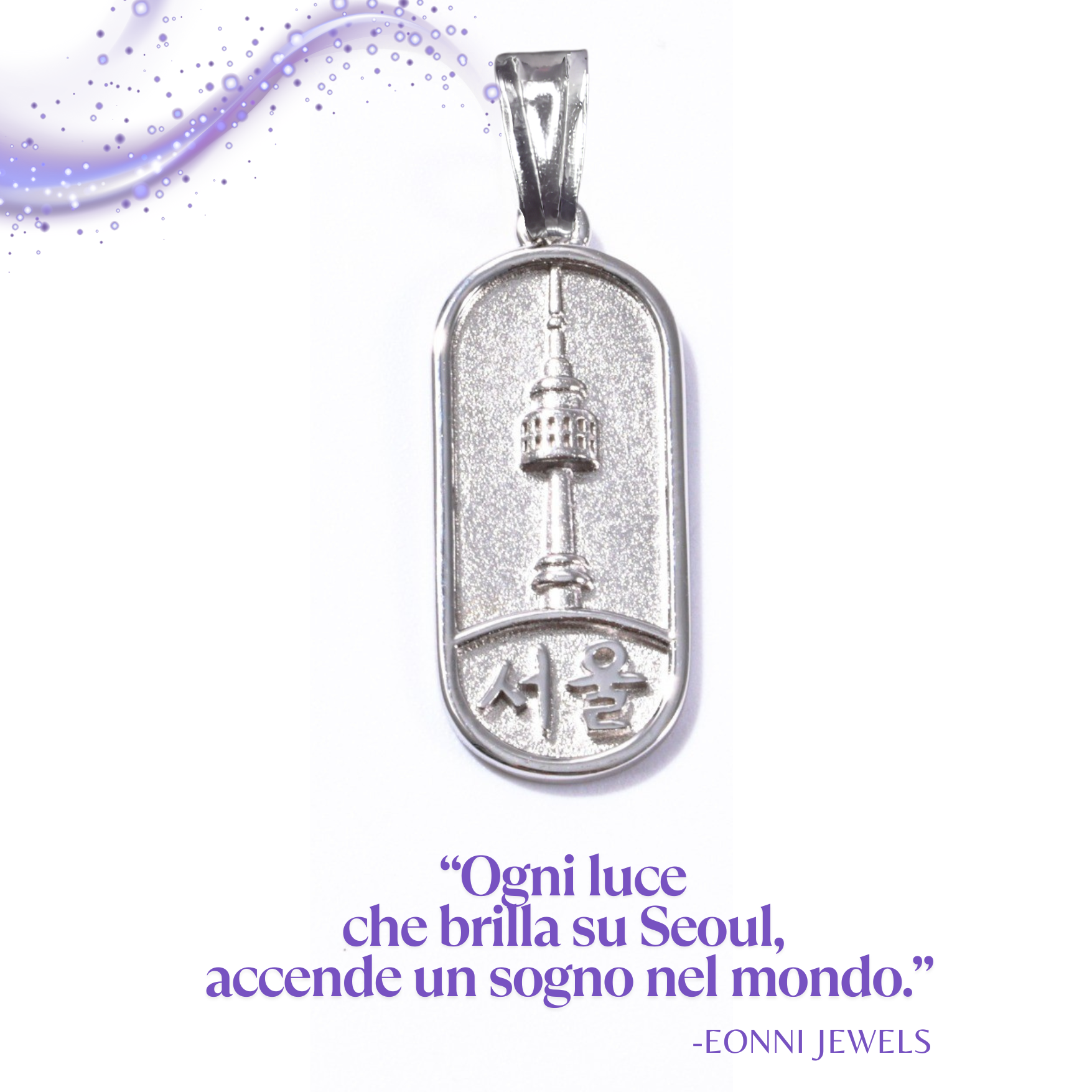 Porta con te l’anima di Seoul con questo ciondolo in Argento 925, con la silhouette della Namsan Tower, simbolo dell’amore, della comunicazione e dei desideri condivisi.