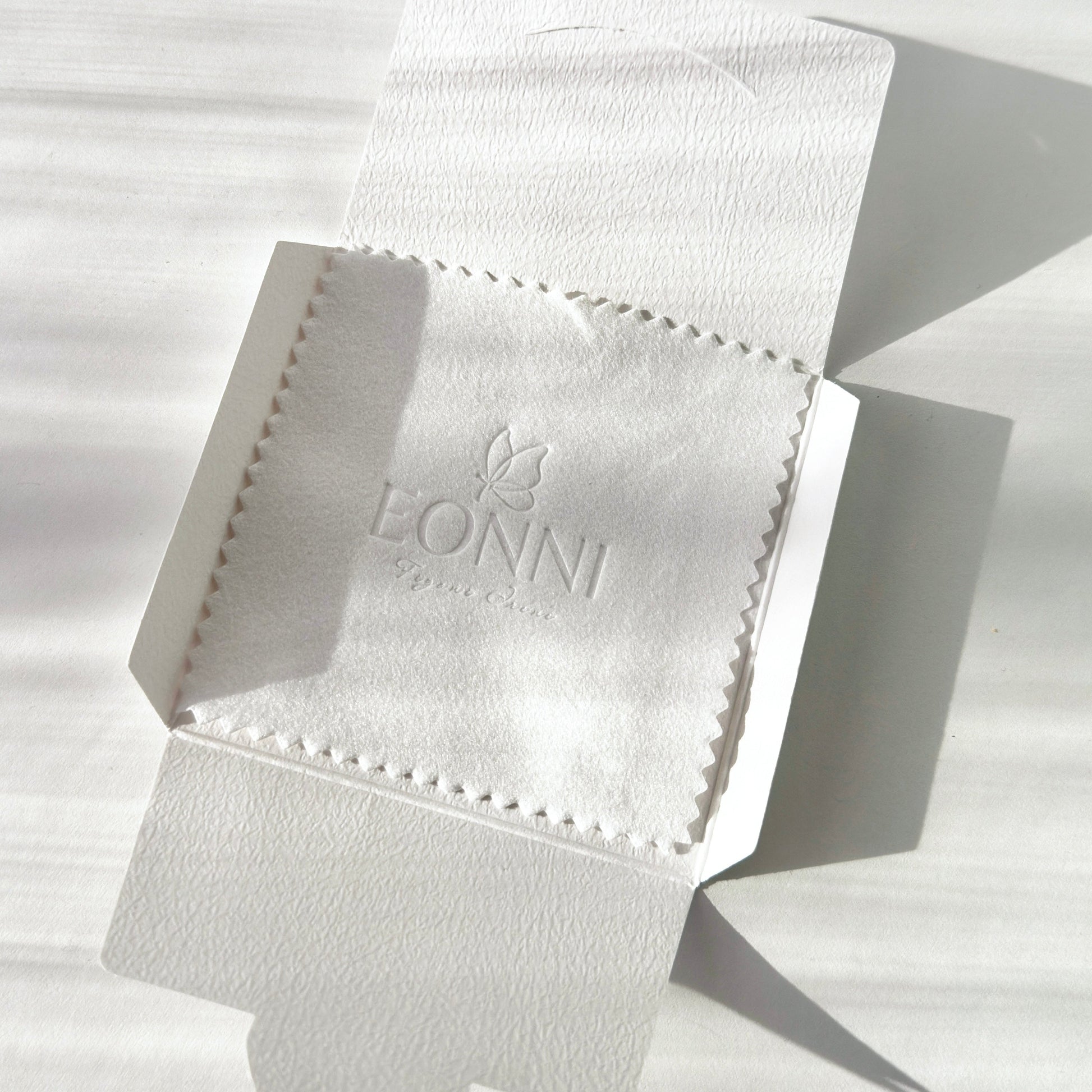 Il panno Eonni è realizzato in microfibra ultra-morbida con i loghi Eonni impressi in tono su tono, pensato per pulire e lucidare delicatamente i tuoi gioielli in argento 925 senza graffiarli.